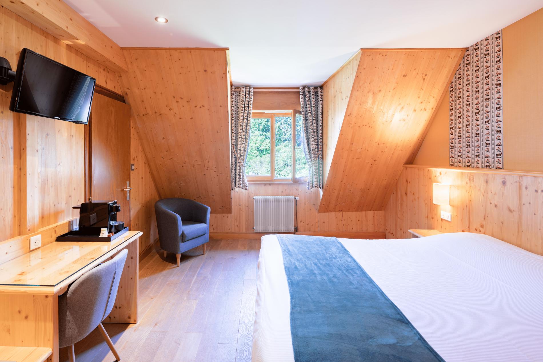 Warm presence of wood, luminosity and openness to the surrounding nature from the small balcony; the Coeur de Marie rooms provide a cosy atmosphere.